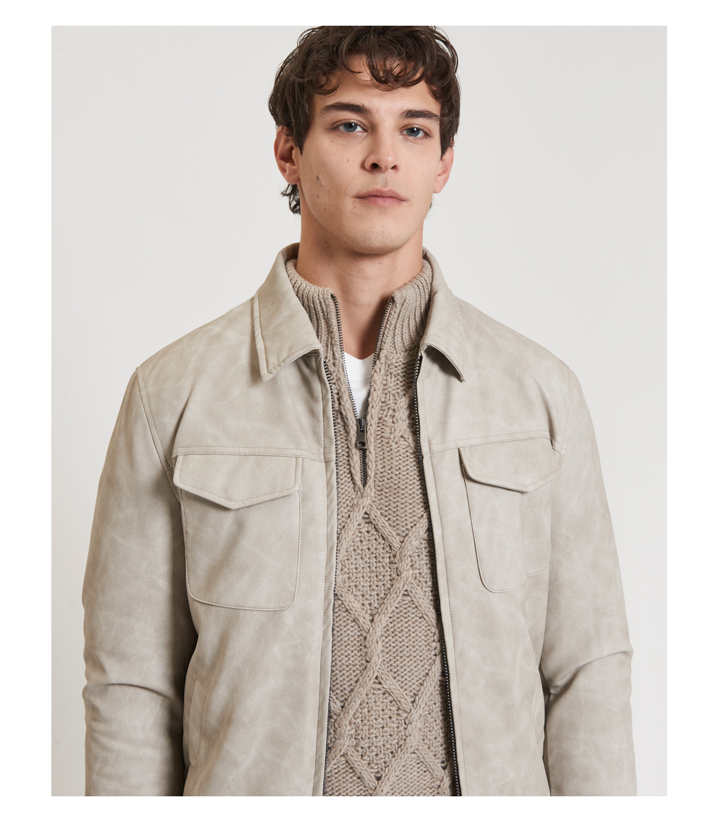 Una versione contemporanea del classico bomber, questa giacca in ecopelle presenta un colletto stile camicia, tasche applicate e laterali con zip e una chiusura frontale con doppia zip. La finitura liscia e resistente all’acqua e la fodera interna morbida offrono comfort e carattere. Perfetta per uno stile moderno e deciso.