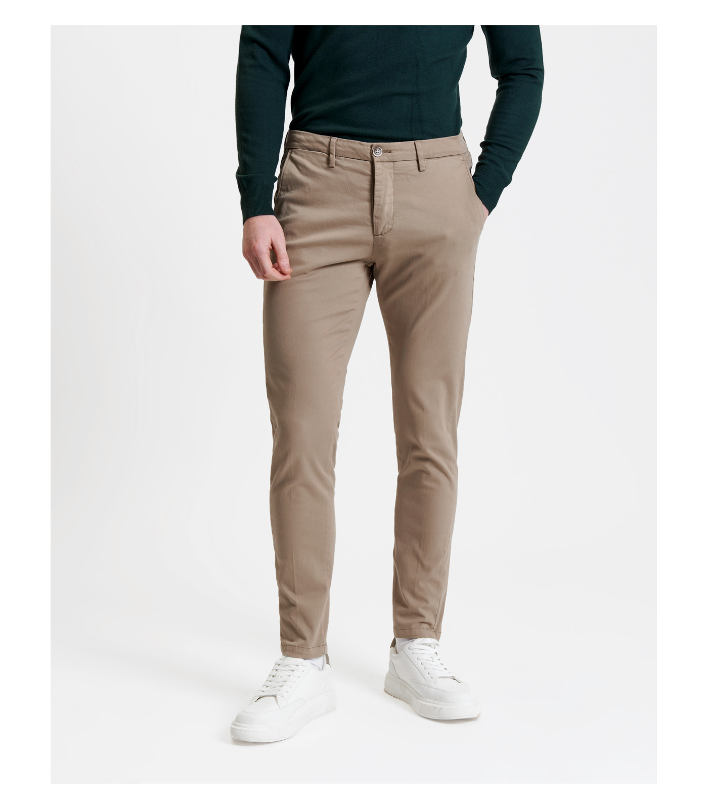 Realizzati per il comfort moderno, questi pantaloni slim fit presentano tasche laterali oblique, chiusura con zip e dettagli posteriori rifiniti. Il tessuto in cotone elasticizzato garantisce libertà di movimento e una vestibilità impeccabile, perfetti per l’ufficio o le serate fuori.